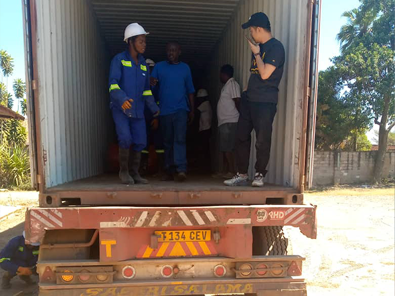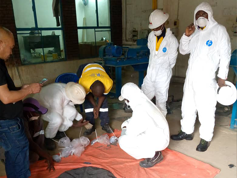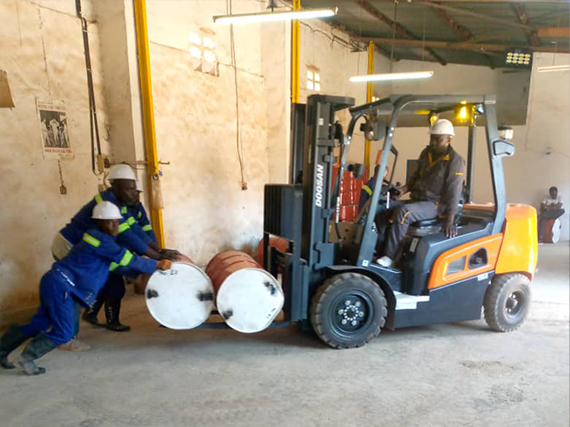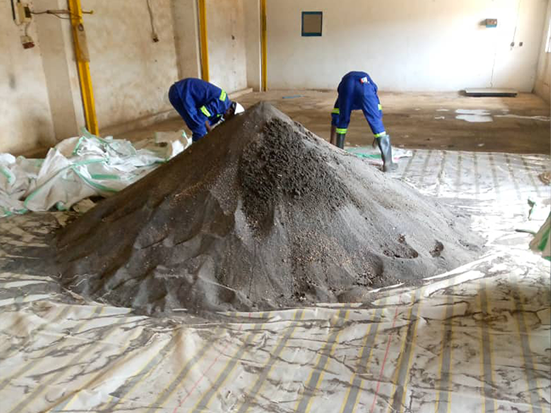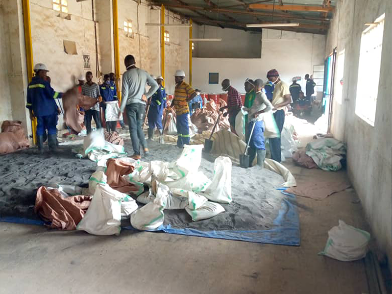 Dans notre usine de traitement à Lubumbashi en pleine activité de traitement, mixage, d’échantillonnage, d’enfûtage et de chargement.